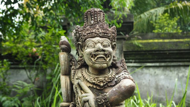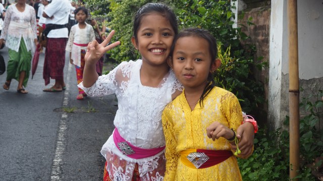 Ce sont de grandes statues colorées qui représentent le démon sous les formes les plus variées, et défilent en procession dans les rues, portées à bout de bras sur des supports en bambou, dans toutes les villes et villages de Bali, à grand renfort de musique. Tout le monde a revêtu son habit traditionnel, et nous n’y échappons pas.